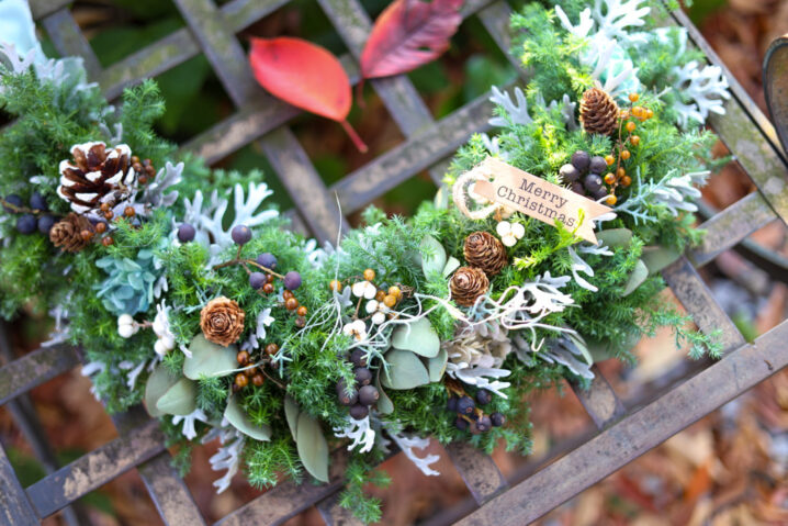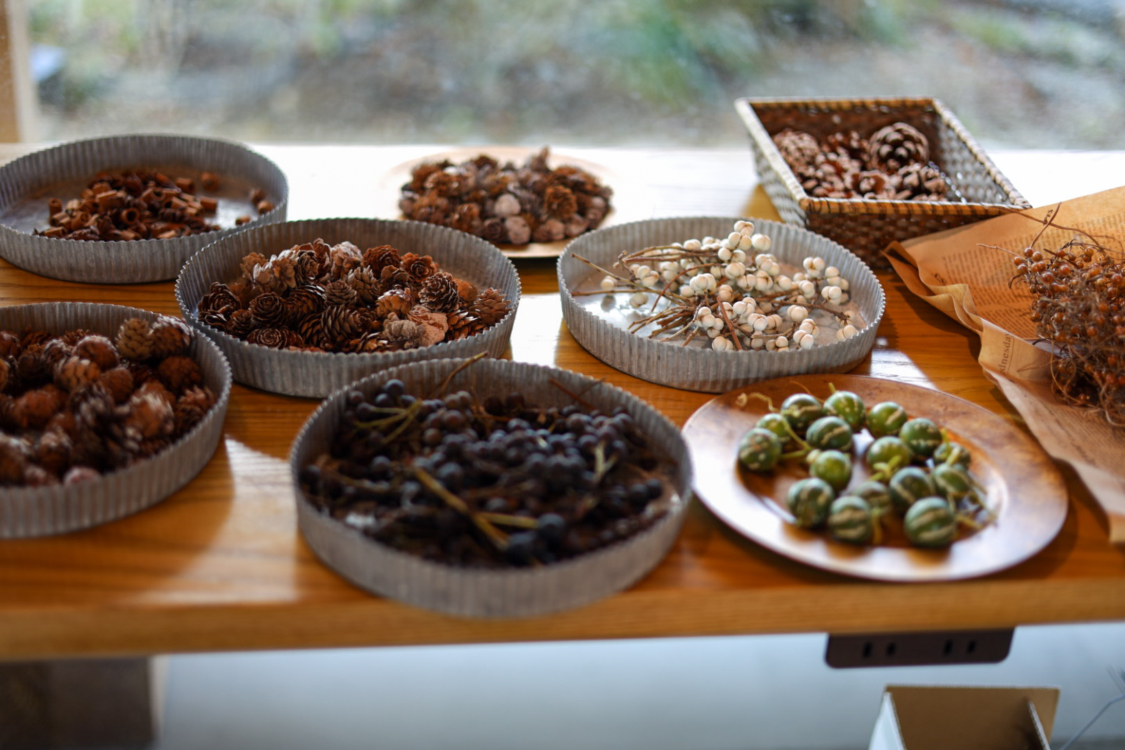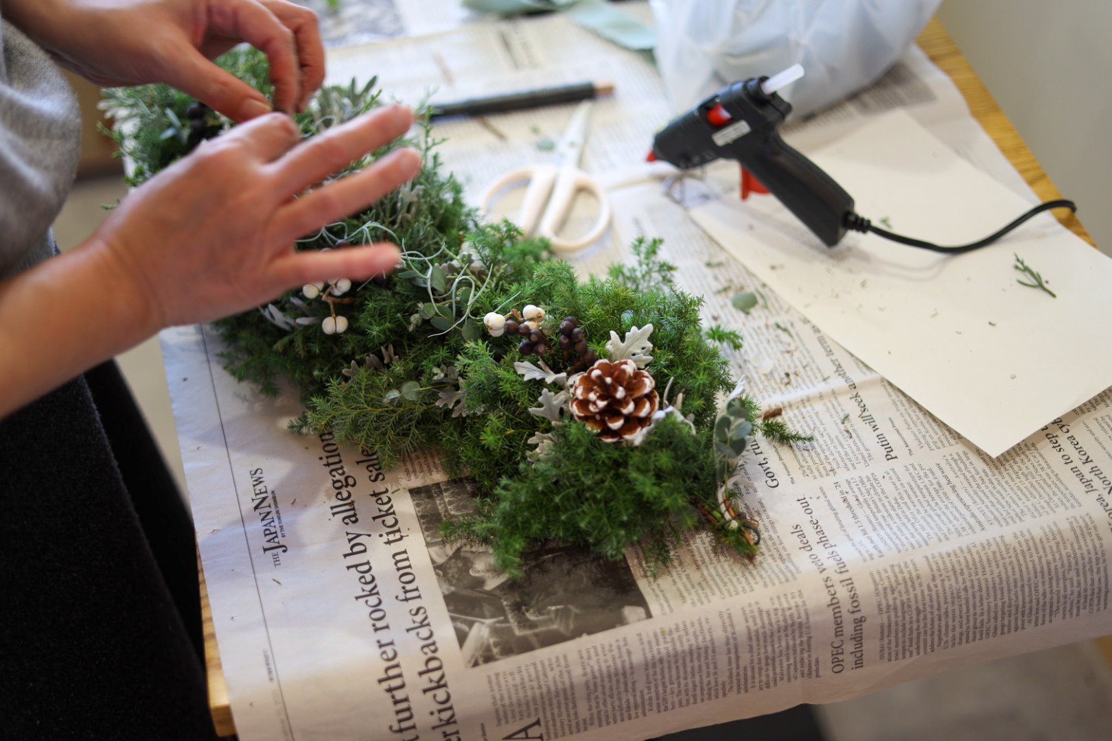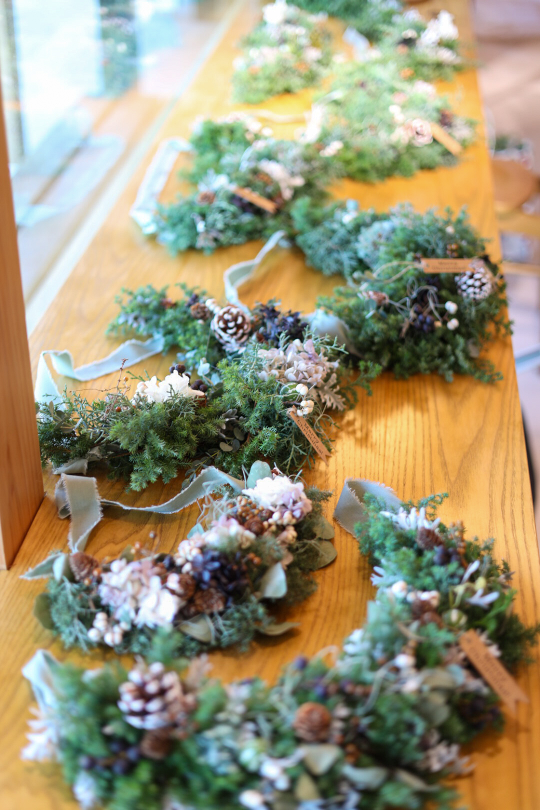 今年のクリスマスのワークショップは、内容を変えて開催しています。今回はクリスマスガーランドを作りました。1回目は、ガーランド作りをしました。2回目は、恒例のテーブルツリー、3回目は、キャンドルアレンジメントの予定です。