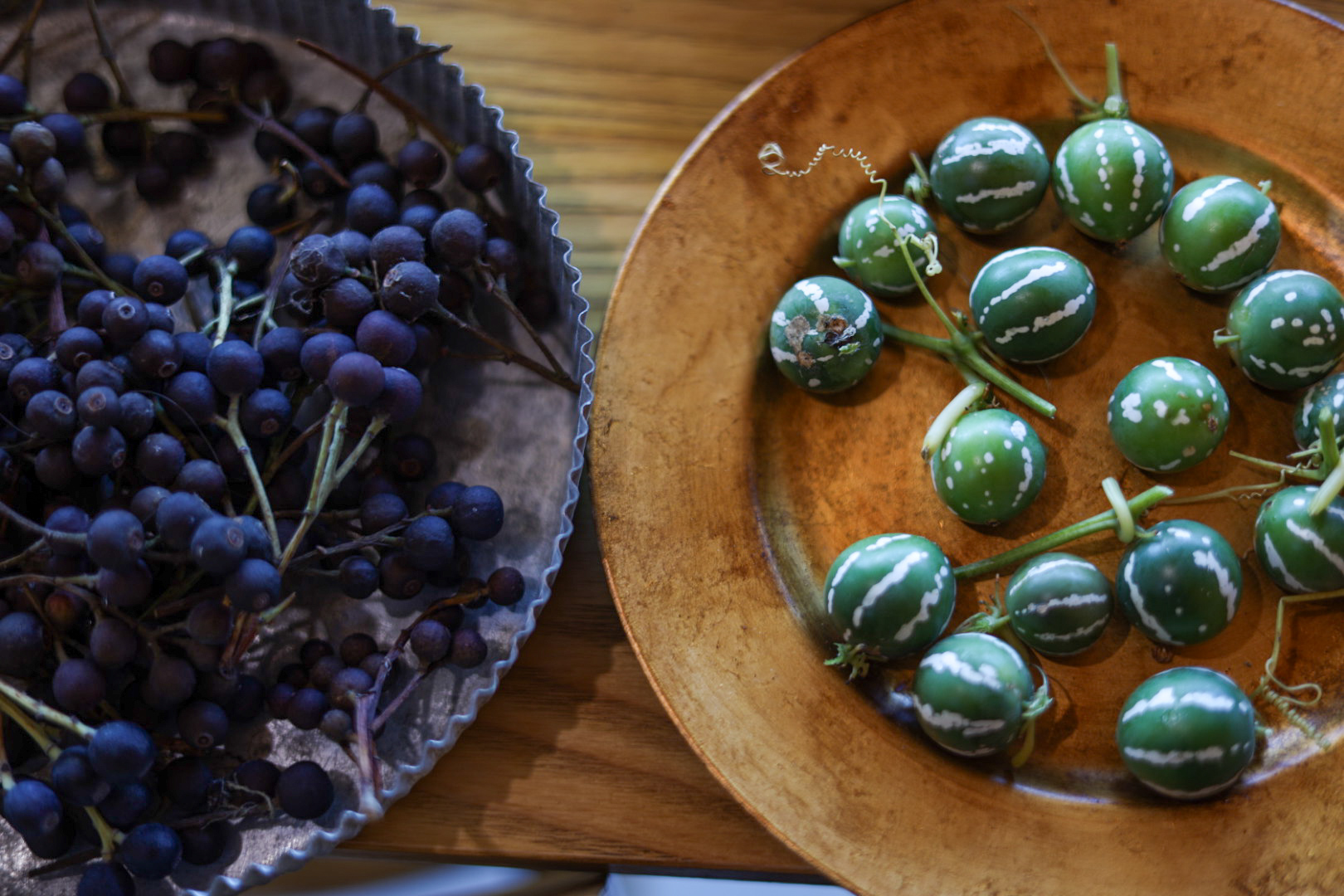 デコレーションをします。木の実や、アジサイなどお好みで色合いなどを考えながらグルーガンで貼り付けていきます。赤い身を使わずに自然な感じの色合いの大人っぽいガーランドが出来上がります。赤い実をたくさん使いますとまた、感じがグッと違って見えます。グルーで貼り付ける時のコツは、なるべく上の方に飾ることです。フレッシュな葉っぱをたくさん重ねますので、かなり重みがあり、下向きになりがちです。時間が経って乾きますと、軽くなります。最初、乾くまではテーブルなどに平置きにしていただき、乾いてきたところで、壁に吊るすのがいいかもしれません。