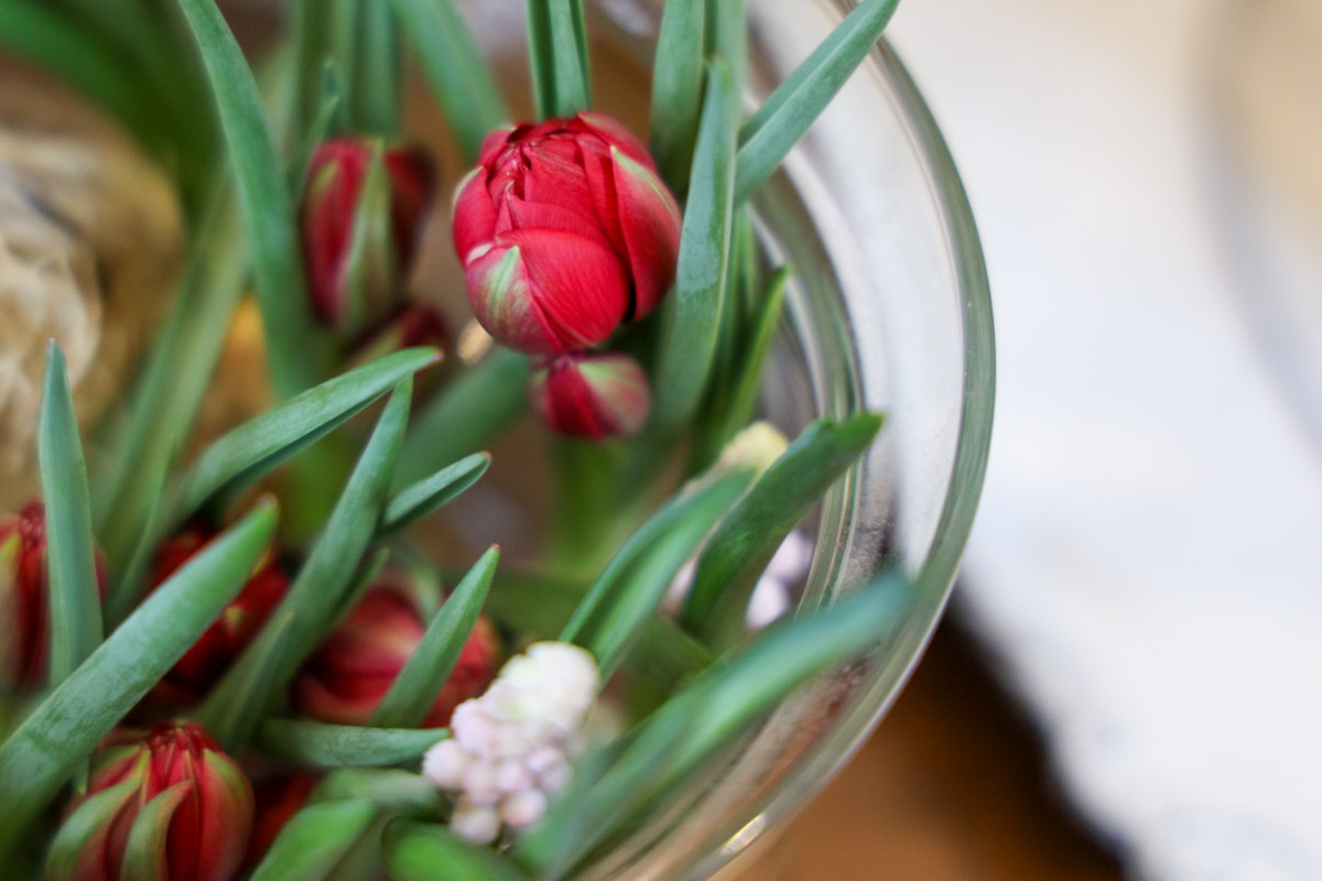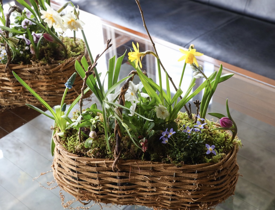 今日のアレンジは、ナチュラルに籠の中に森の一場面、自分が想像する小さな植物の世界を作れたら完成です。毎年、仕入れる球根でも販売業者により品物が違ってきます。今年のプスキニアなどは、花芽が大きくとてもきれいな球根でした。毎年、球根アレンジをすると球根が増えていくのですが、アレンジが終わった後は、鉢植えにしたり、お庭に植えてぜひ、来年もお花を咲かせてください。ヒヤシンスがいつ頃咲くかも楽しみです。籠の中で一斉に咲くとどんなイメージになるのでしょうか。さて、来月は、何を楽しもうかな。