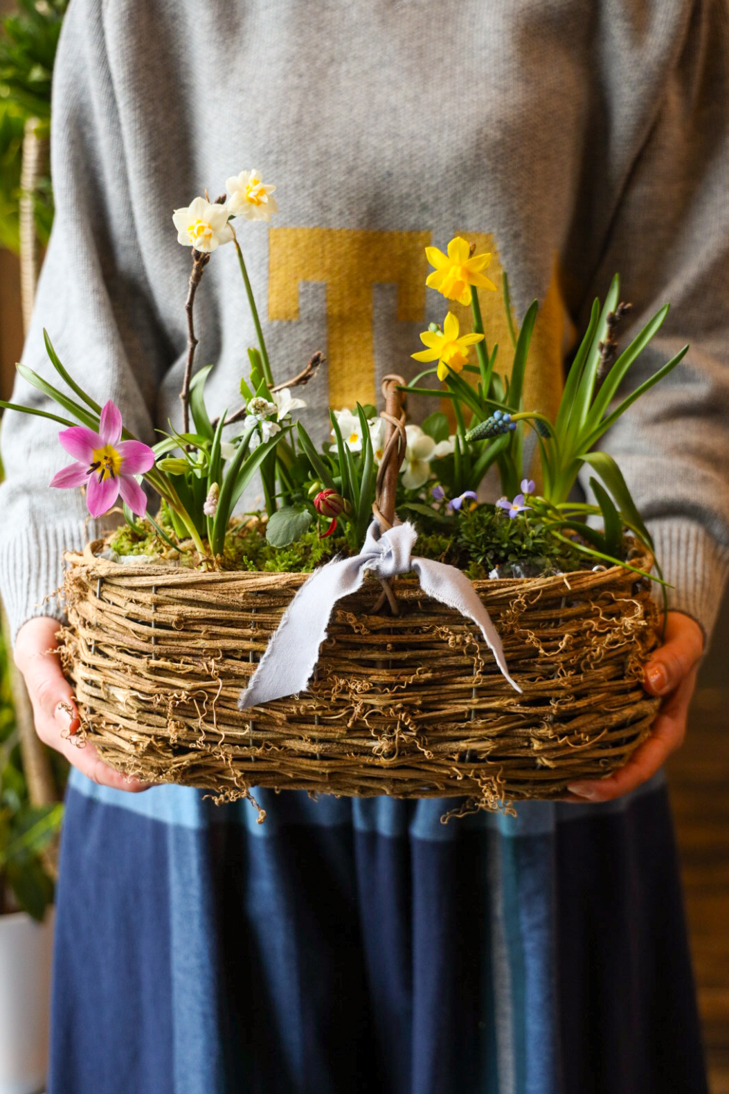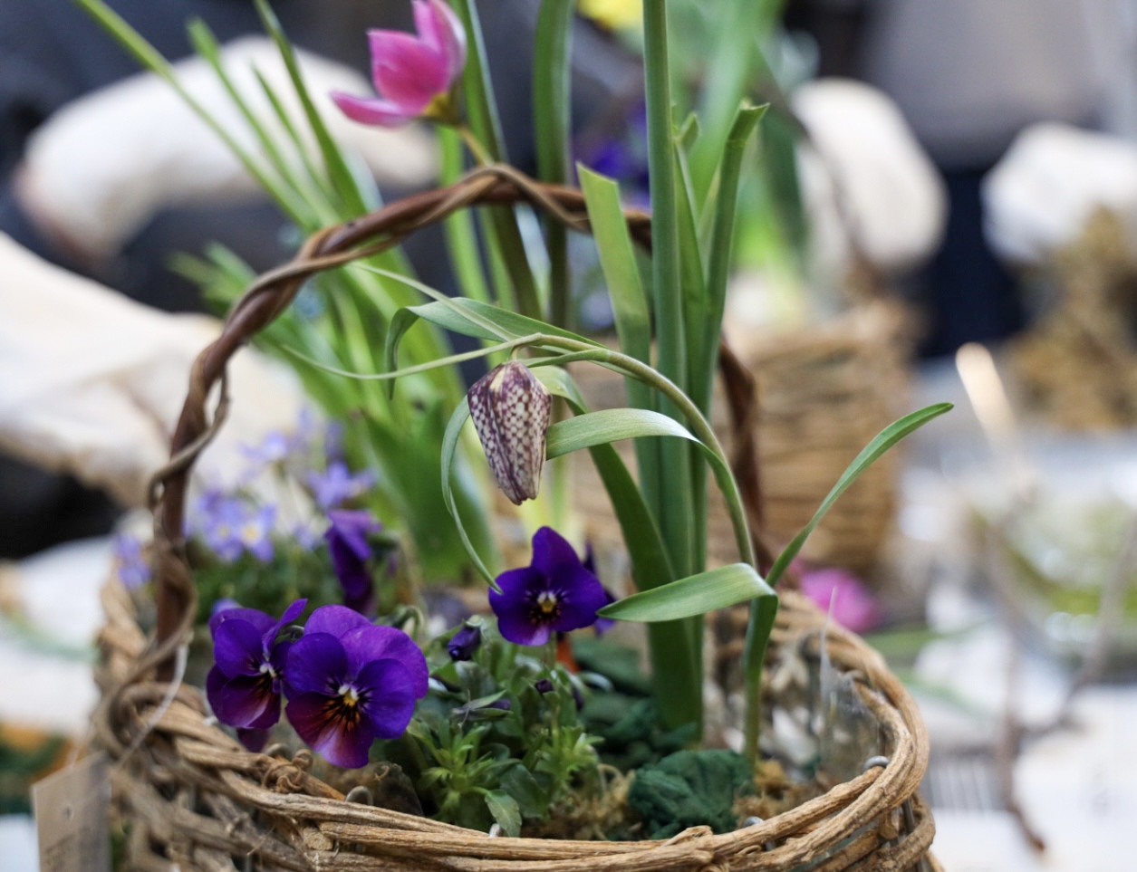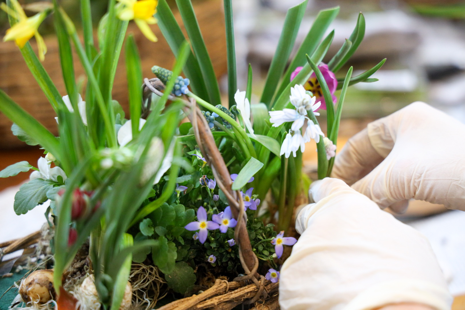 スイセン(ティタティタ)、スイセン(ホワイトライオン)、ヒヤシンス、ムスカリ(ピンク)、ムスカリ(ブルー)、オーニソガラム、プスキニア、チューリプ(原種)、チューリップ(テタテ)、フリチラリア、ビオラ、ヒナソウ、桜の小枝、ミズゴケ、ハイゴケです。