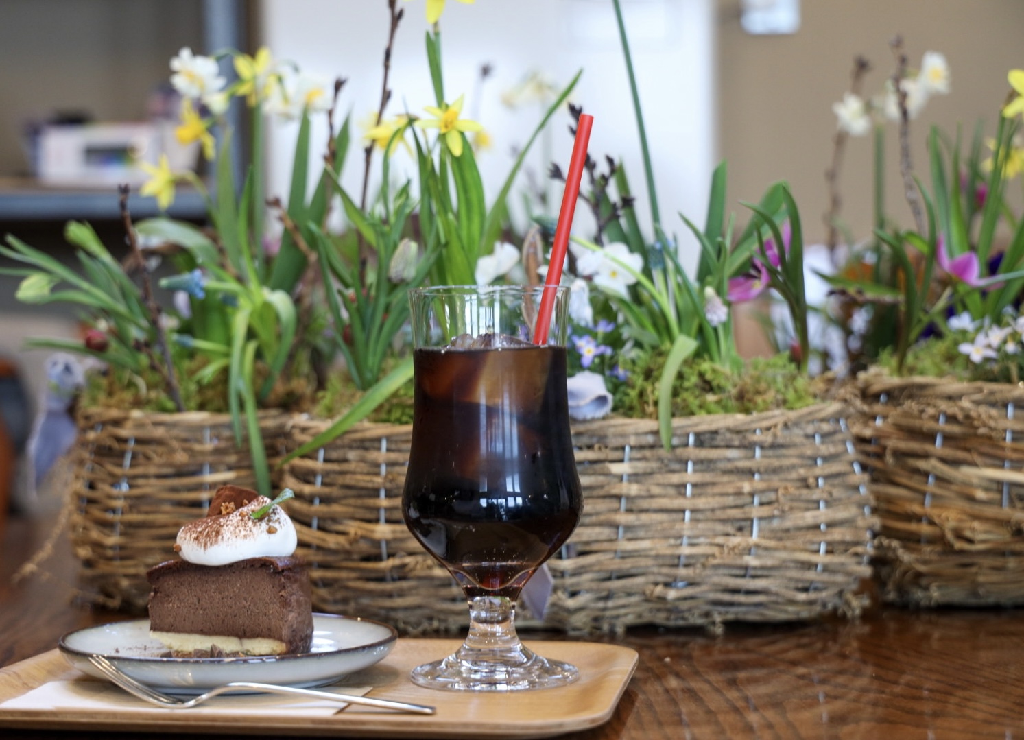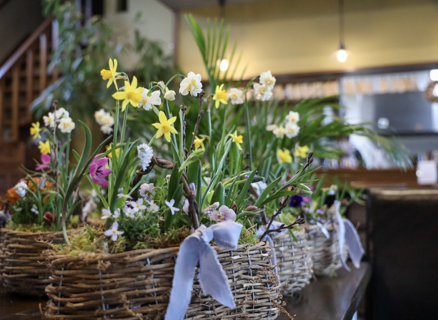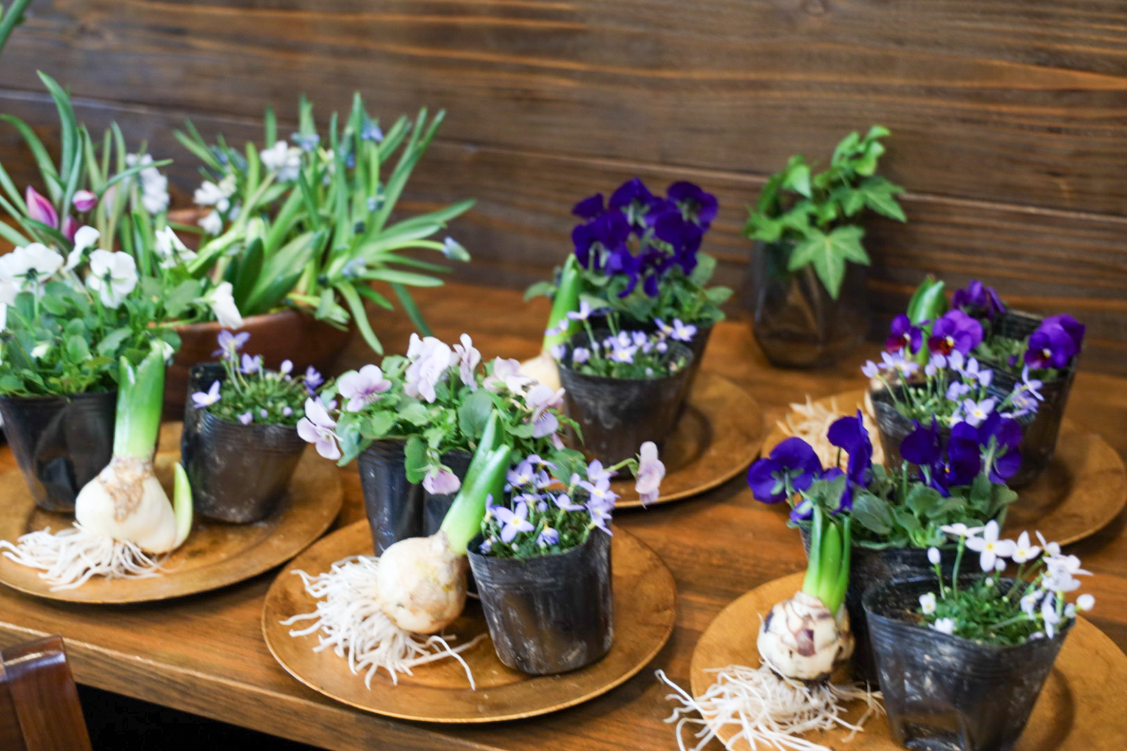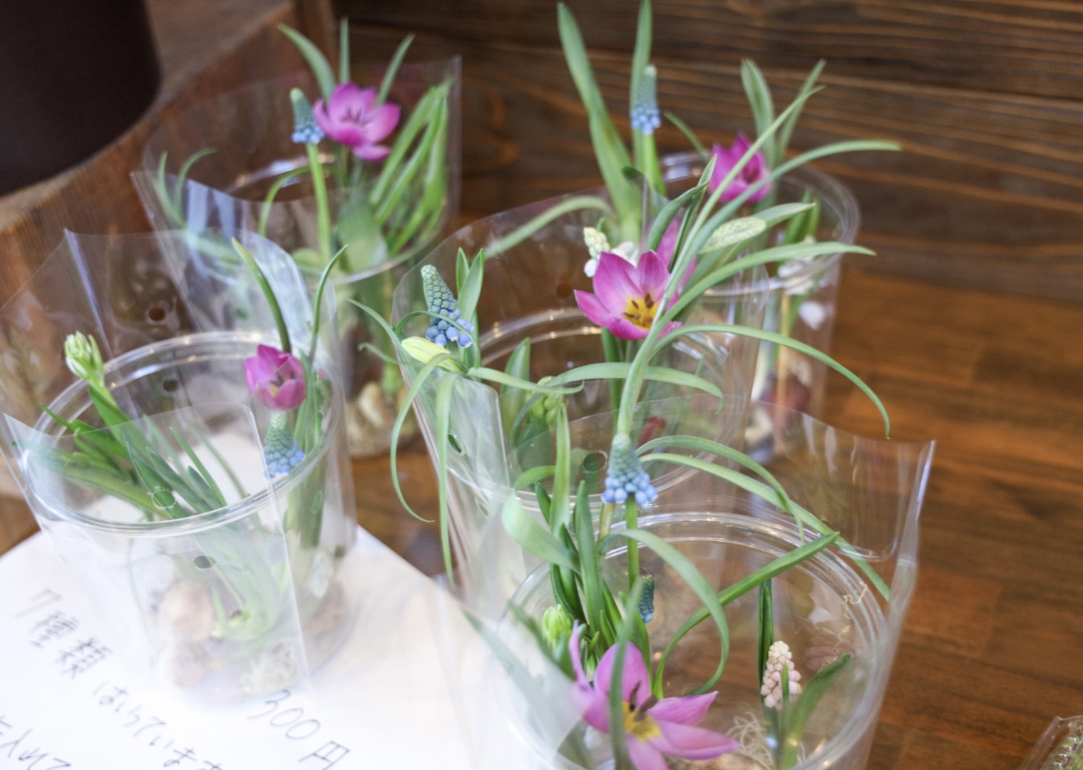 スイセン(ティタティタ)、スイセン(ホワイトライオン)、ヒヤシンス、ムスカリ(ピンク)、ムスカリ(ブルー)、オーニソガラム、プスキニア、チューリプ(原種)、チューリップ(テタテ)、フリチラリア、ビオラ、ヒナソウ、桜の小枝、ミズゴケ、ハイゴケです。