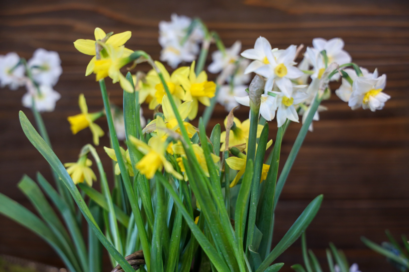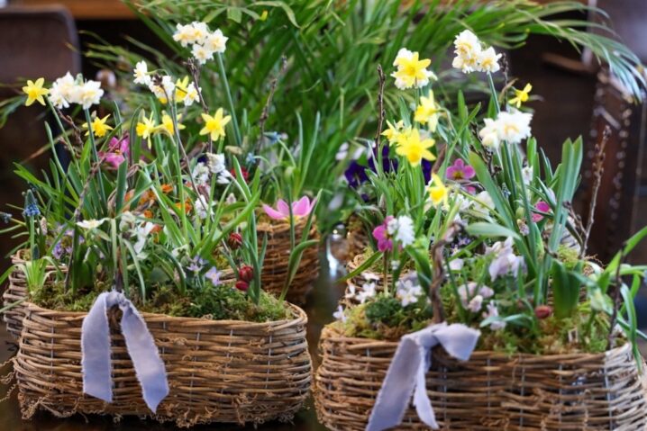 そして、今回はナチュラルな籠を準備しました。去年、一昨年がブリキの入れ物でしたので、今回は変えてみました。芽出し球根にヒナソウを合わすのが好きです。