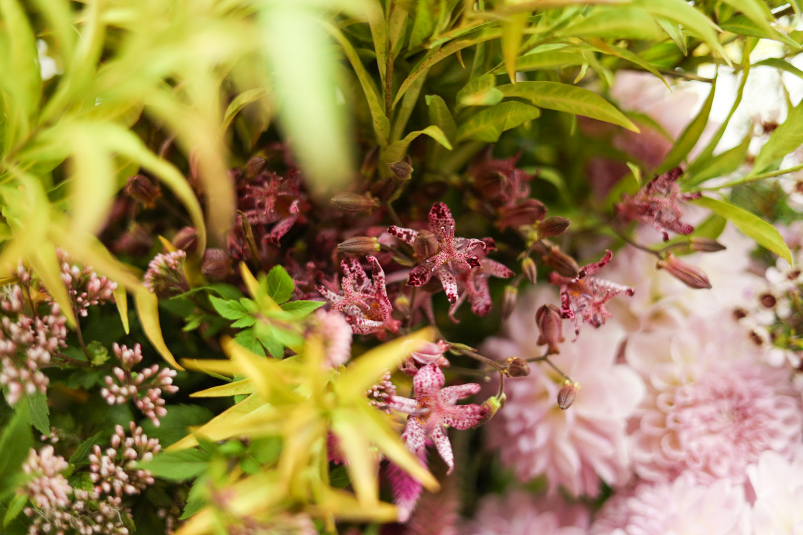 コスモス(八重咲き ダブルクリックポンポン)ダリア(ナマハゲトゥンク)バラ(リバティール、ラブソディ)ワックスフラワー(ニース)チョウジソウ、ホトトギス、ノブドウ、セロシア、フジバカマです。ほとんどが秋ならではの植物です。