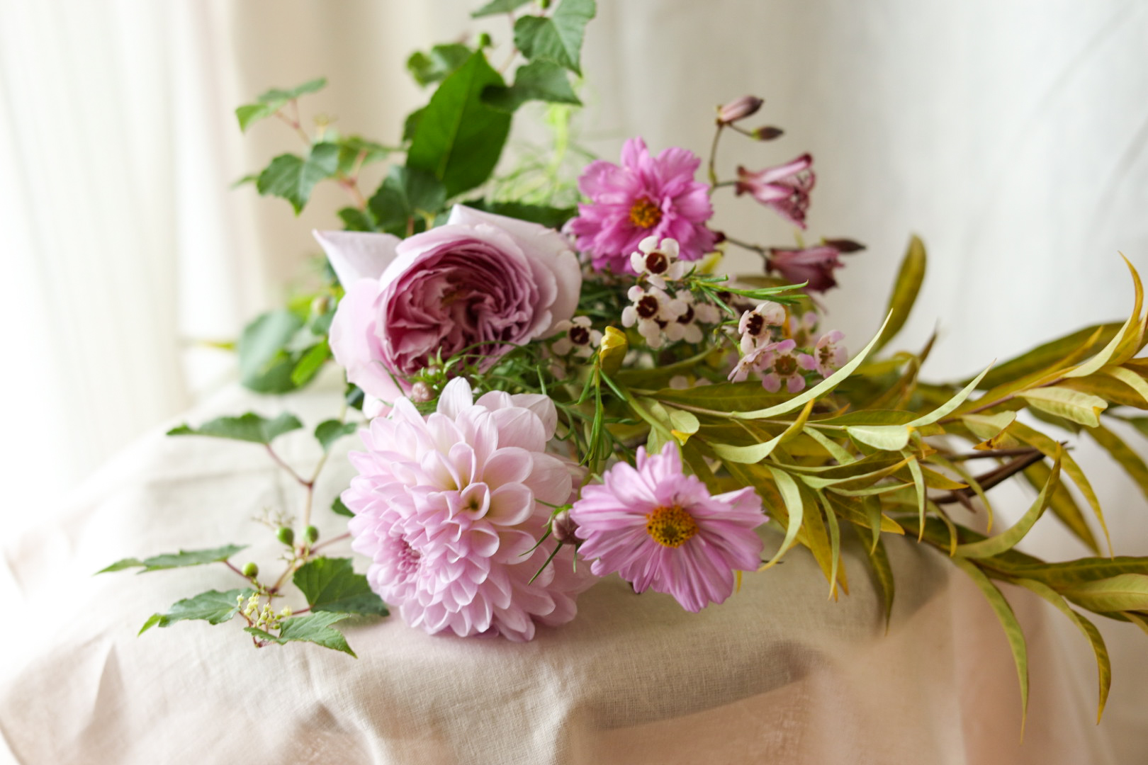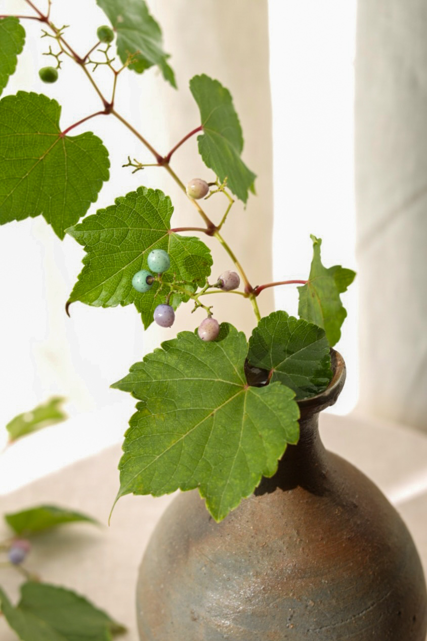 今回は、秋の植物を使ったアレンジメントでした。秋は黄色やオレンジ色のイメージもありましたが、ノブドウも使いたかったですし、ナマハゲシリーズのダリアを使いたかったので、このダリアに合わせて色を選びました。いつもの安らぎのカラーです。お花や植物を飾ってみようと思う方が一人でも増えたら嬉しいです。