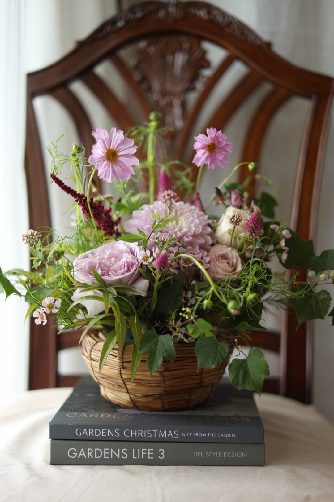 高松市林町にあるsizuc内にあるentreさんにて10月11日にワークショップを行いました。秋といえばコスモスの季節です。コスモスを使って秋の植物のかごアレンジメントを作ってみました。