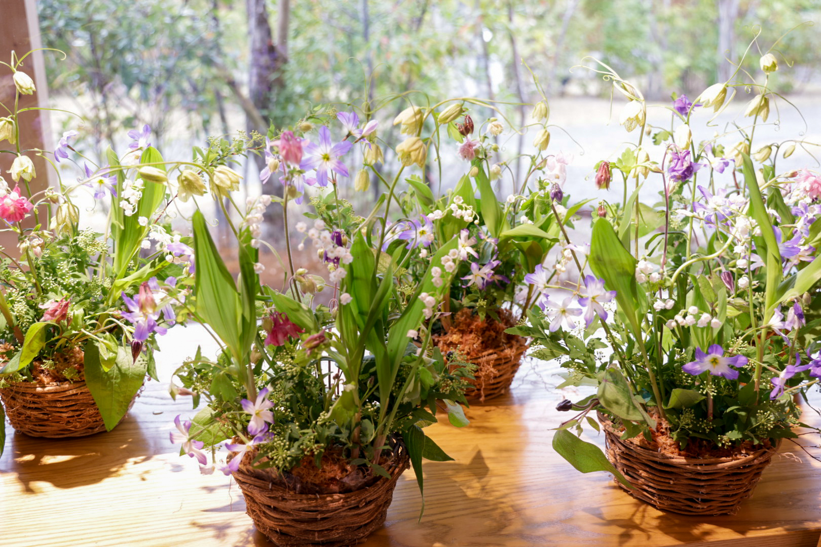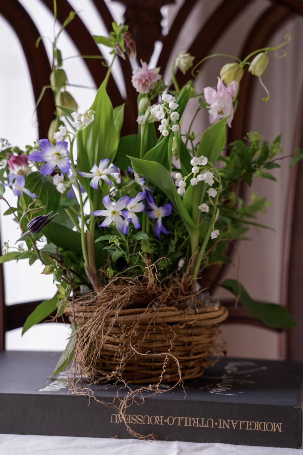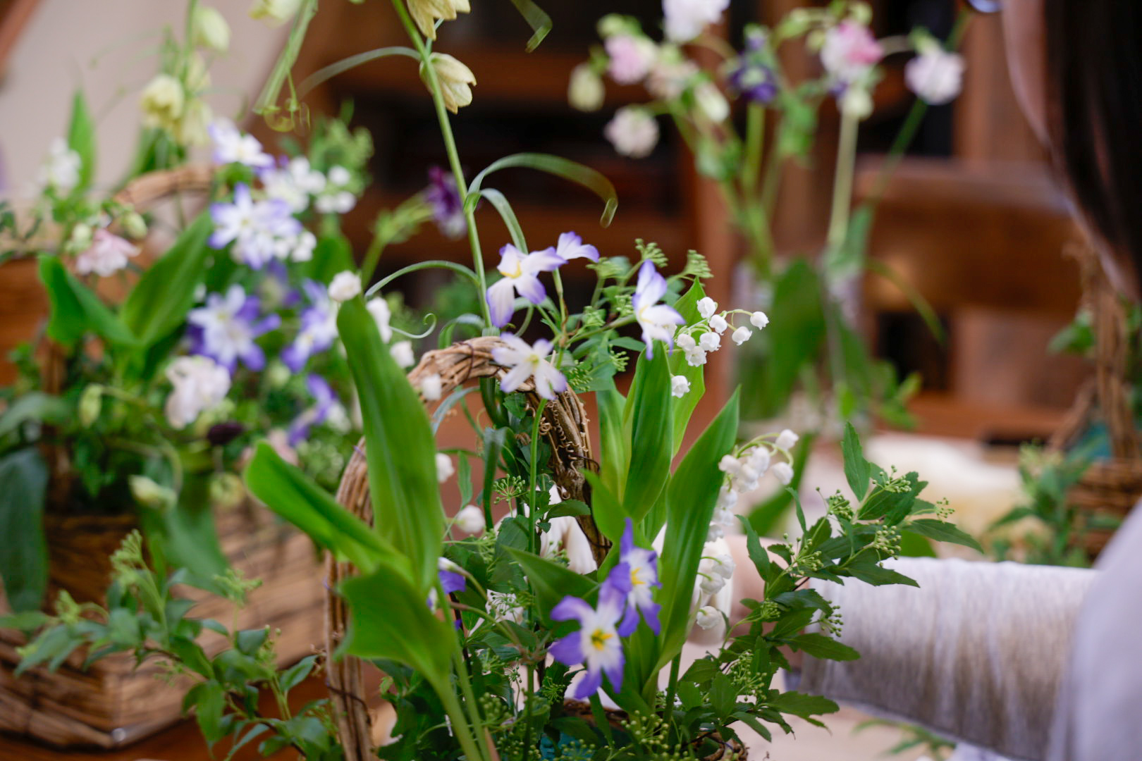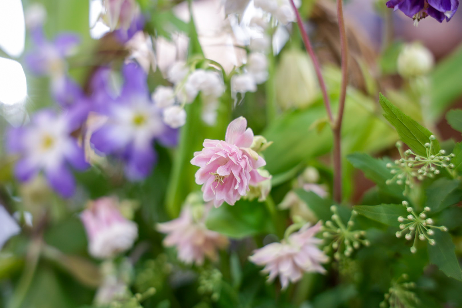 スズラン(根つき)、リューココリーネ(2種)、オダマキ、コデマリ、クレマチス、バイモユリです。お花の色は、紫系でまとめてみました。スズランの小さくて可憐なお花が埋もれてしまわないようにお花選びに気を遣うところです。オダマキのお花の形や色、スズランのちいさなお花のフォルムはお花好きさんにはたまらないようです。また、バイモユリの葉っぱのくるりんとした様子もかわいい姿です。すぐに隣の植物に絡まろうとします。