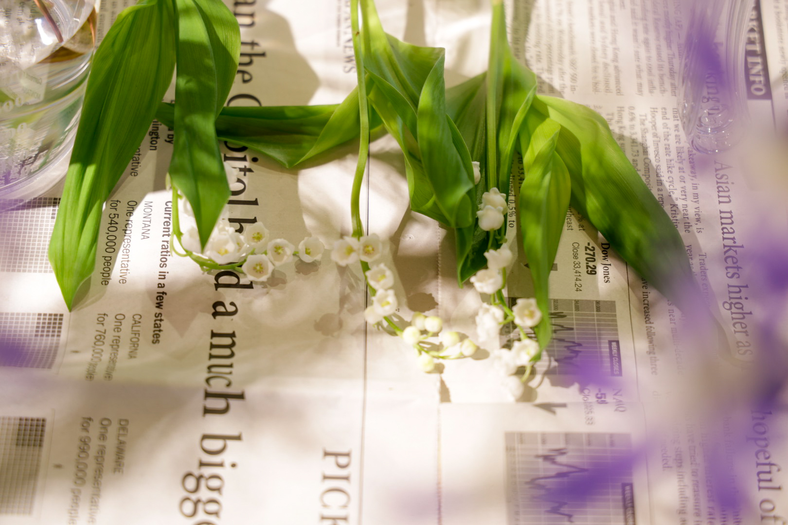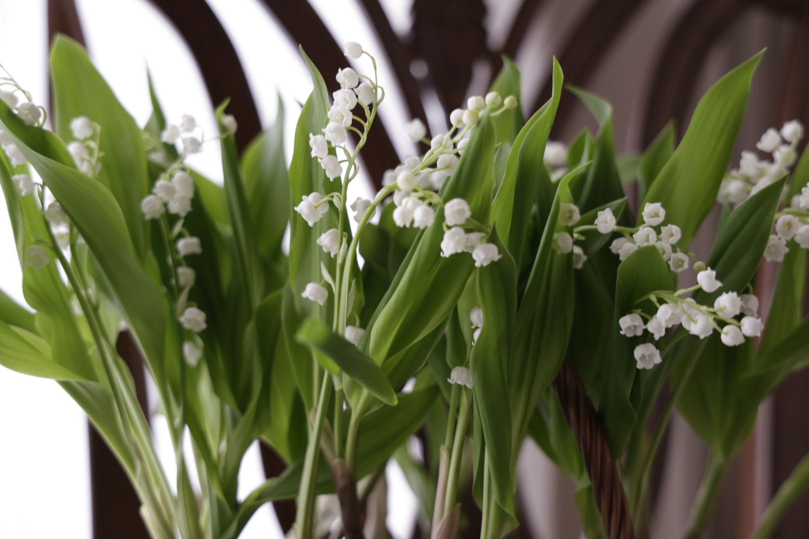 桜の見ごろの春になると必ず楽しみなお花があります。それは、すずらんです。香りも爽やかで、何といっても、どうしてそんなにかわいいのっていうくらいお花の形が小さくて、フォルムがかわいいです。そのスズランを使って、アレンジをしました。