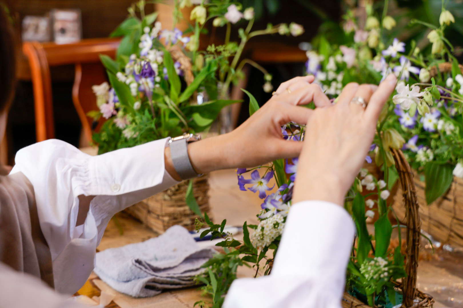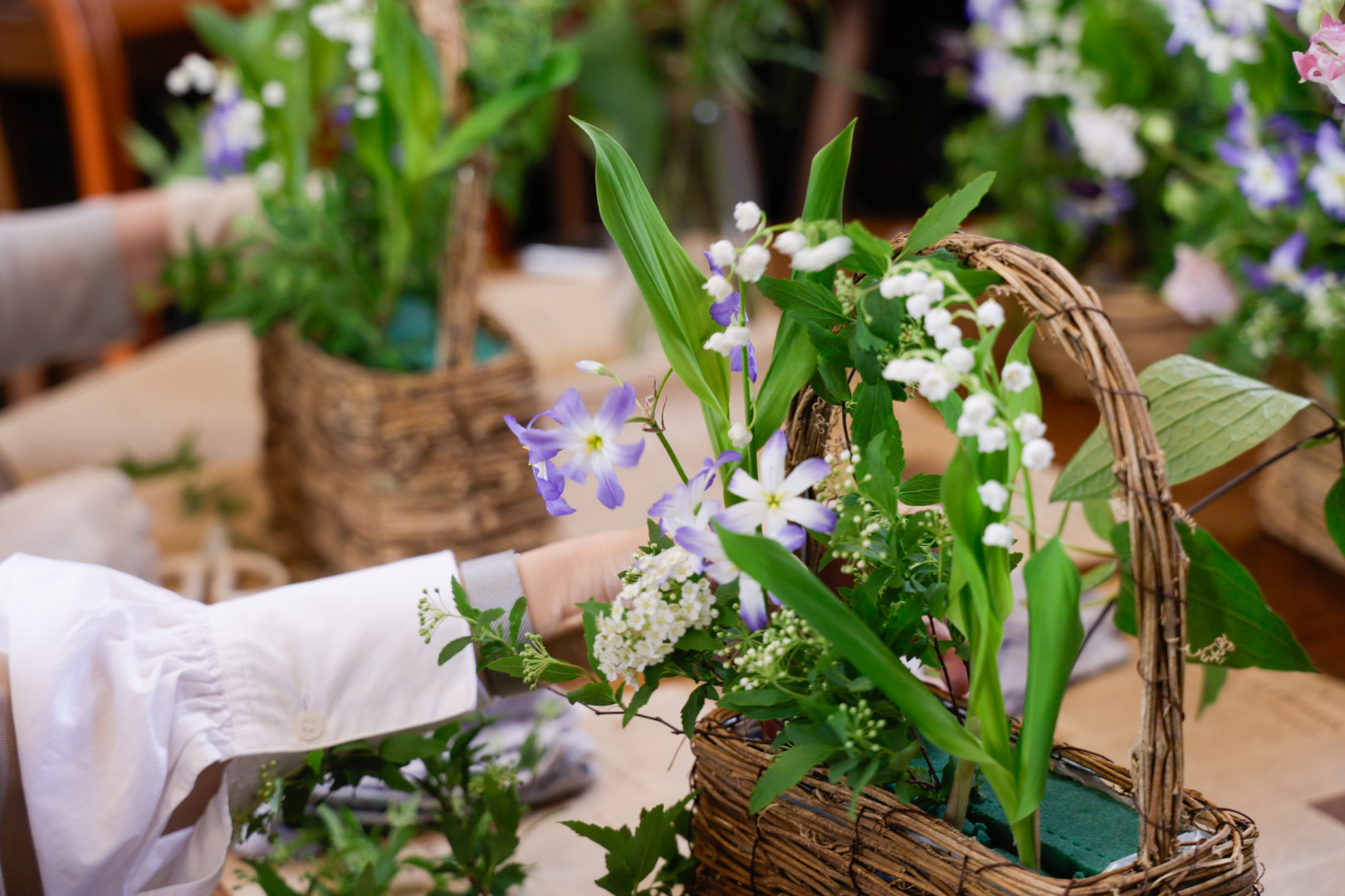 今回は、なかなかお花屋さんでは見られないスズランを花材に使ってみました。この可愛さは、やっぱり、すずらん好きさんには味わってほしいです。香りとフォルムの可愛さを十分に味わえていただけたら嬉しいです。また、スズランに合わせるお花もあまり主張しない花材を選んでみました。そして、お花が終わったら、スズランは、土に植えて来年、咲くのを楽しみにしましょう。