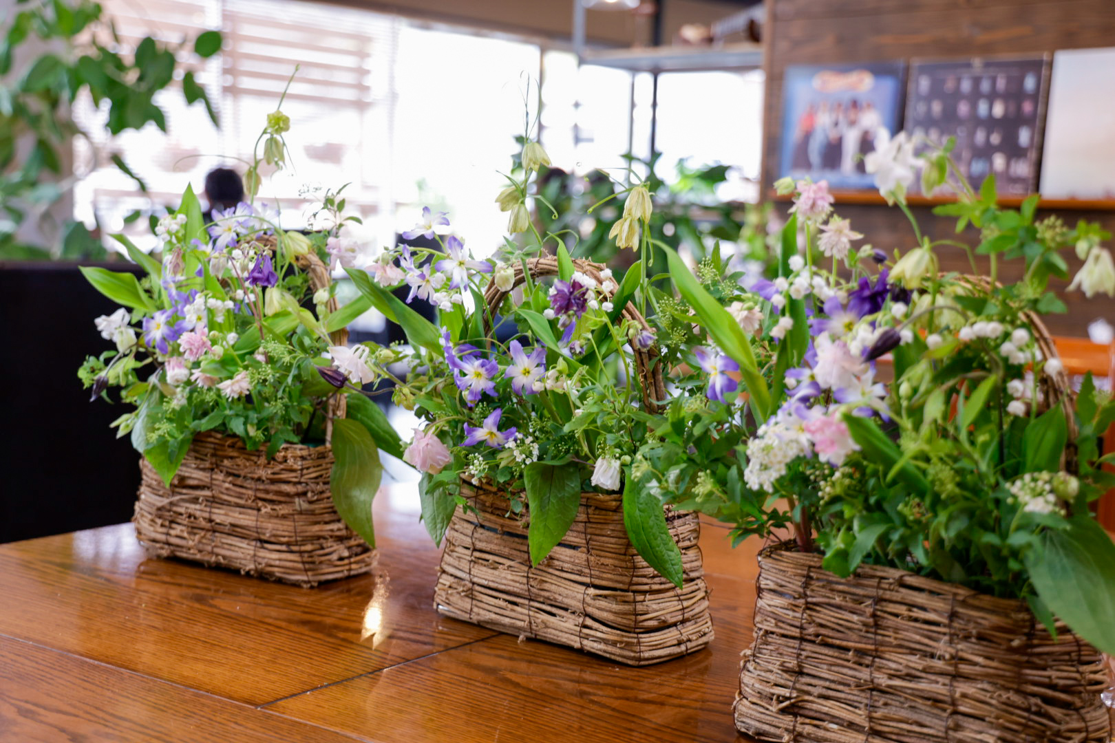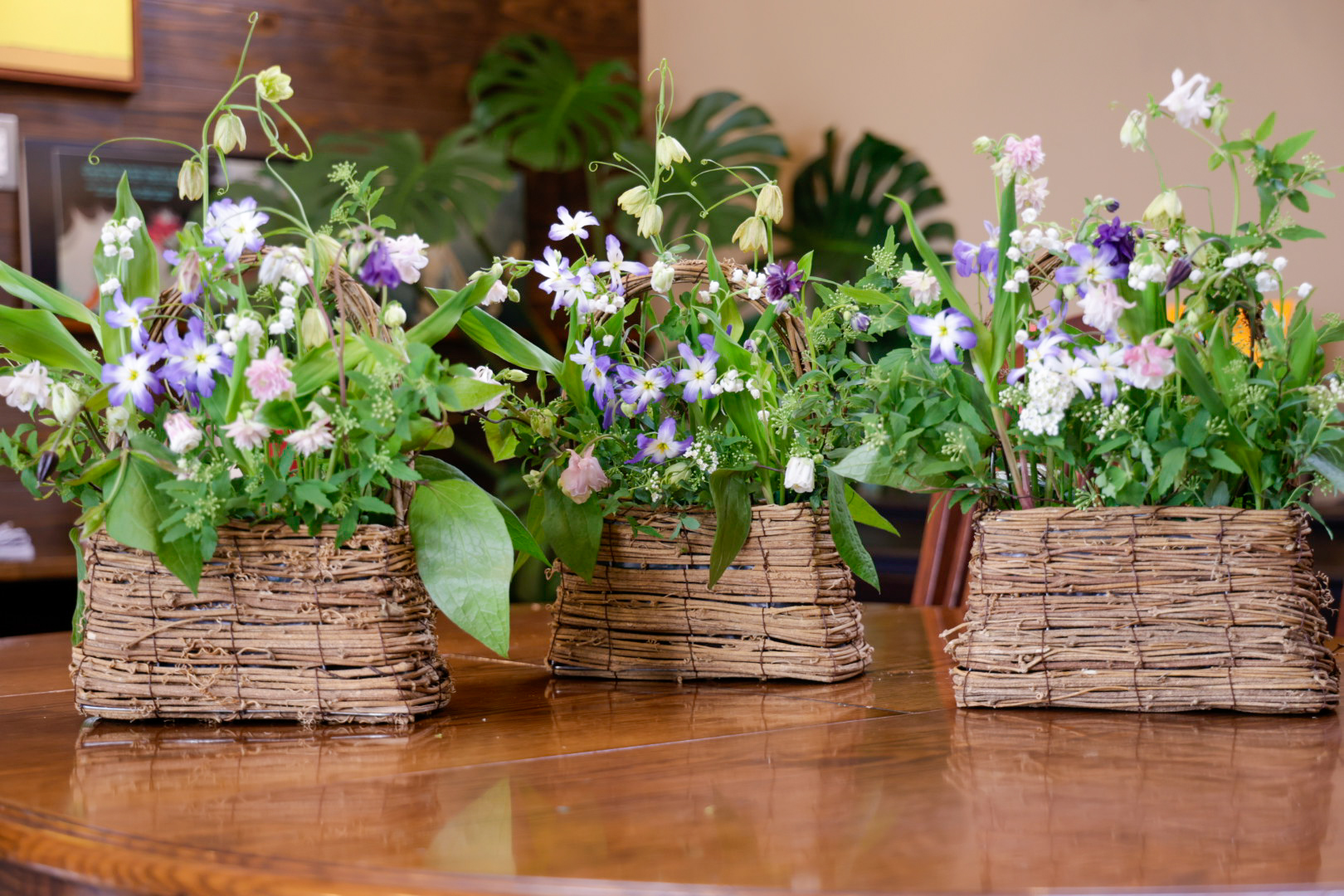 1日目のワークショップは、丸いよくある丸い籠にアレンジしました。2日目のワークショップは、プライベートレッスンで、お花好きさんより、バッグ型の籠を使ってみたいということで、土曜日と同じ花材でアレンジしました。同じ花材でも、雰囲気が全く違って見えます。